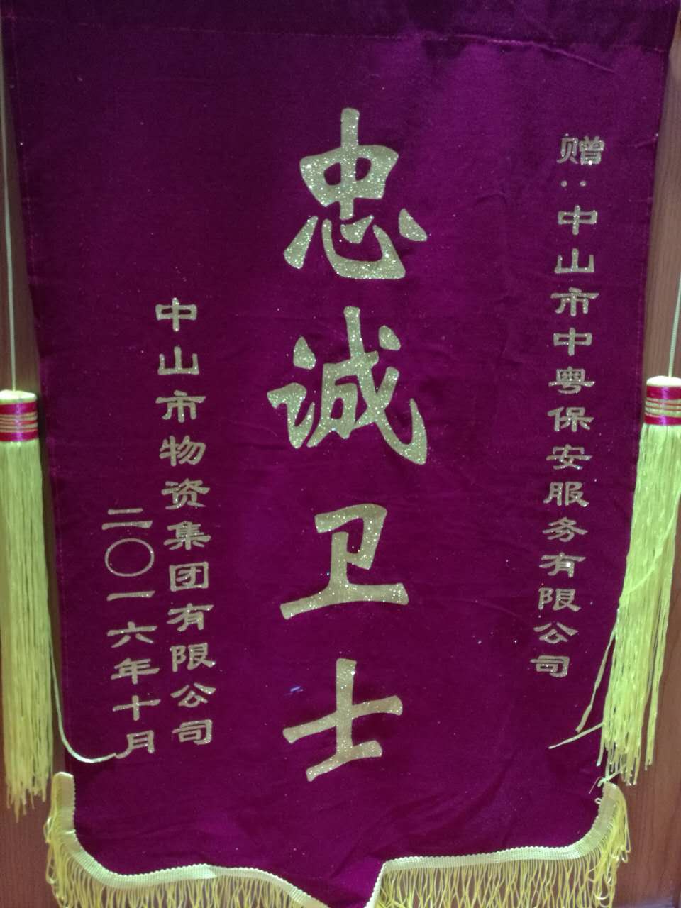 2016年10月,中山市物資集團有限公司贈中山市中粵保安服務有限公司“忠誠衛(wèi)士”錦旗。