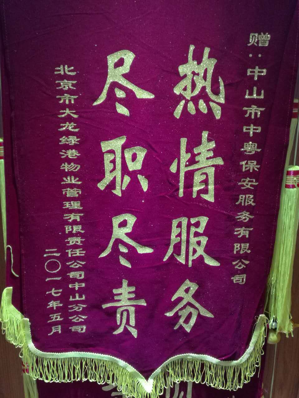 2017年5月,北京市大龍綠港物業管理有限責任公司中山分公司贈中山市中粵保安服務有限公司熱情服務 盡職盡責錦旗。